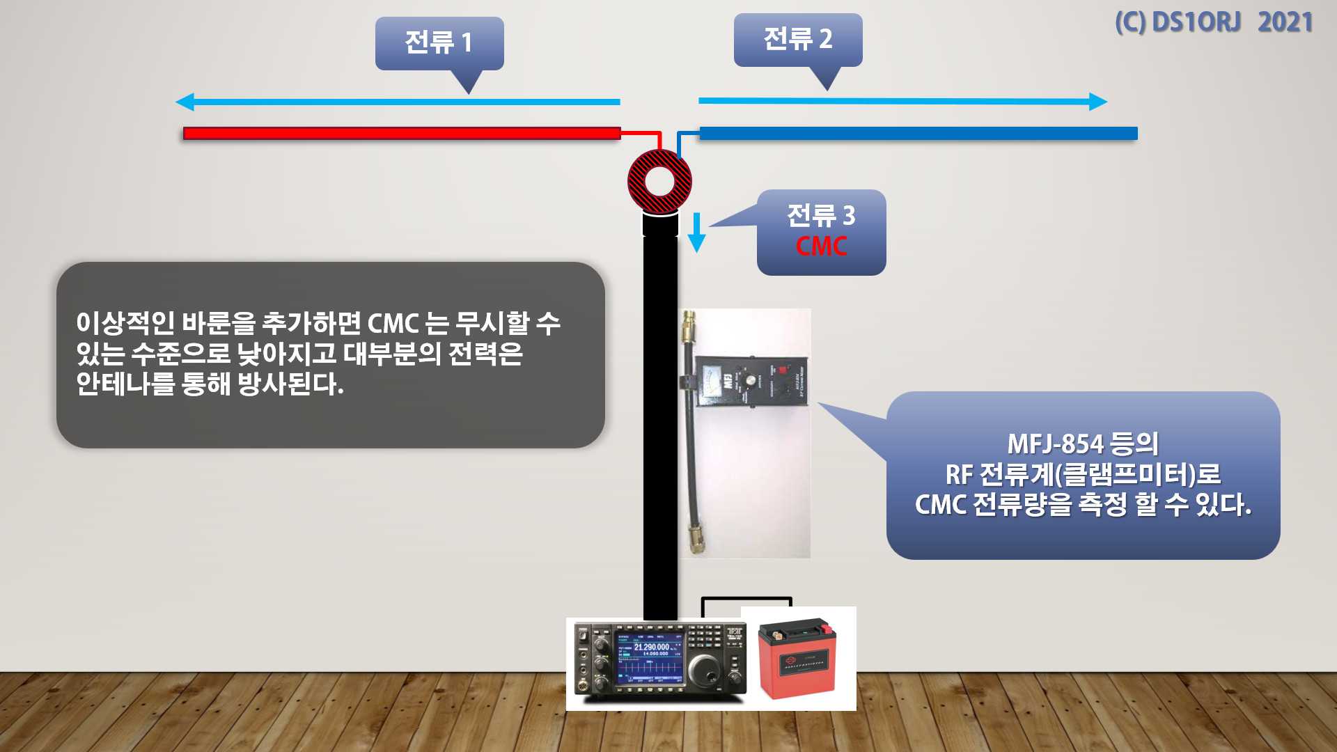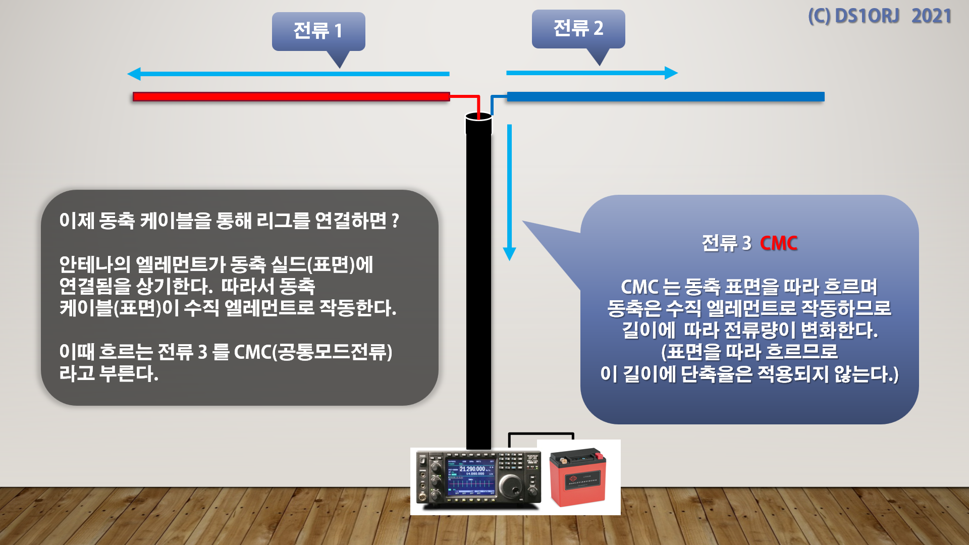 동축 케이블의 실드는 우측의 안테나 엘레먼트와 연결되어 있으므로 안테나로 작동하며 이때 흐르는 전류가 CMC 이다.