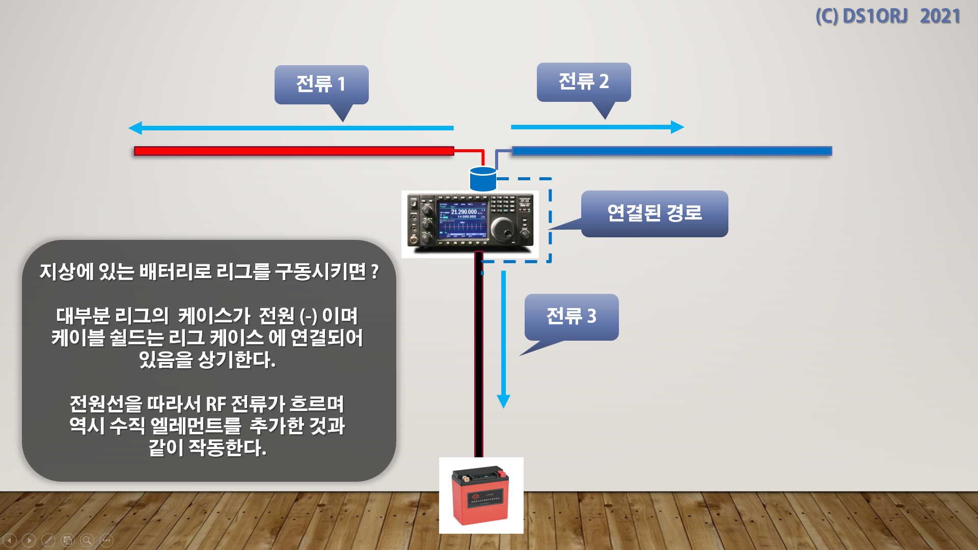 배터리가 아니라 파워 서플라이라면, 파워 서플라이를 통해 집안 전체로 RF 가 유입되며, 이 경로를 따라 역으로 RF 노이즈가 리그로 유입된다.