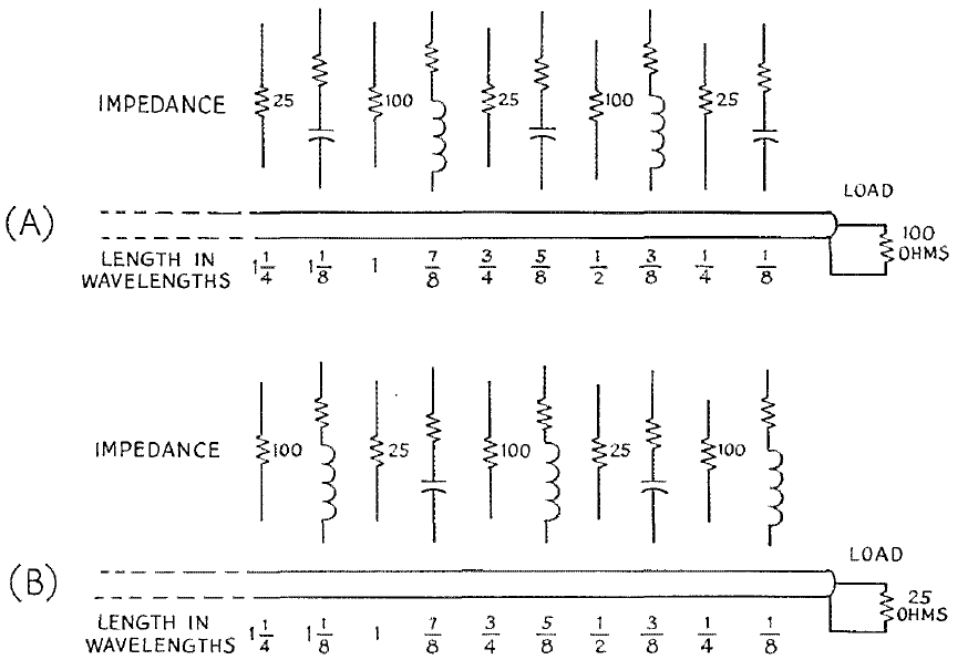 대충 생각할 때 어떤 부하든 케이블 길이 조정으로 50 ohm 을 완벽하게 맞출 수 있다고 생각할지 모르겠지만 실제로는 그렇게 되지 않는다. 그림을 보면 100 ohm 부하에 연결된 50 ohm 케이블은 그 길이를 얼마로 조정하든 결코 50 ohm 의 완벽한 일치를 얻을 수 없다. 25 ohm 부하의 경우도 맞찬가지다.