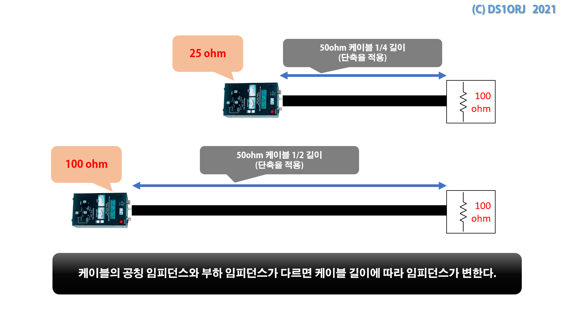즉, 급전선의 특성 임피던스와 다른 부하는 케이블 길이에 따라 L 또는 C 가 추가된 것으로 보이며 1/2 파 길이에서만 원래 값을 보인다.