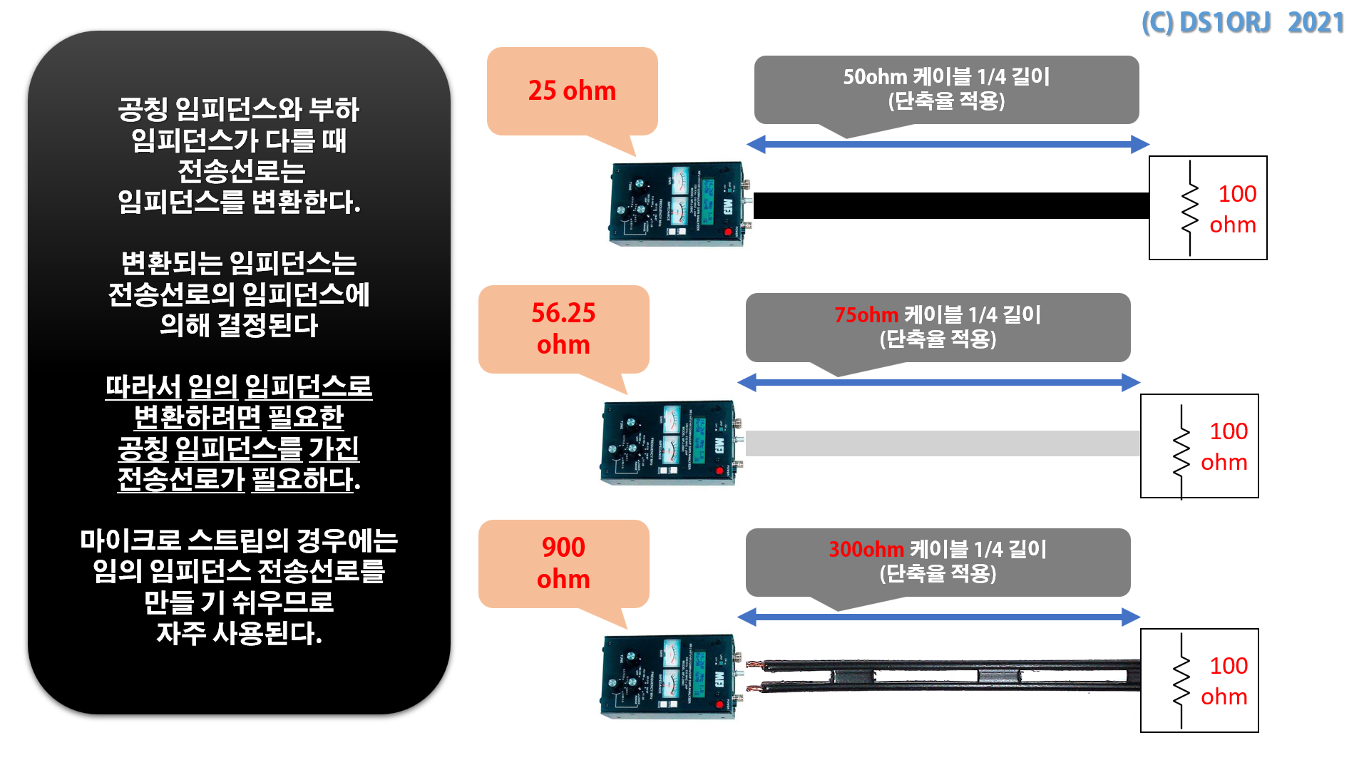급전선의 공칭 임피던스(여기서는 50옴)와 부하 임피던스가 다르면 급전선은 길이에 따라 임피던스를 변환 한다.