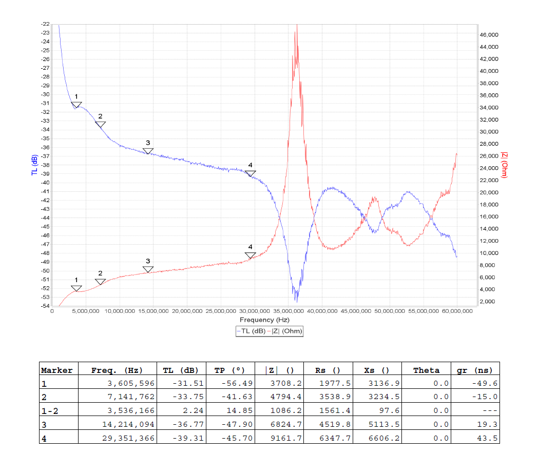 권선을 붙여서 감은 측정치에서는 35MHz 부근에서 분포용량으로 인해 자체공진한 것으로 보이는 흔적이 있다.