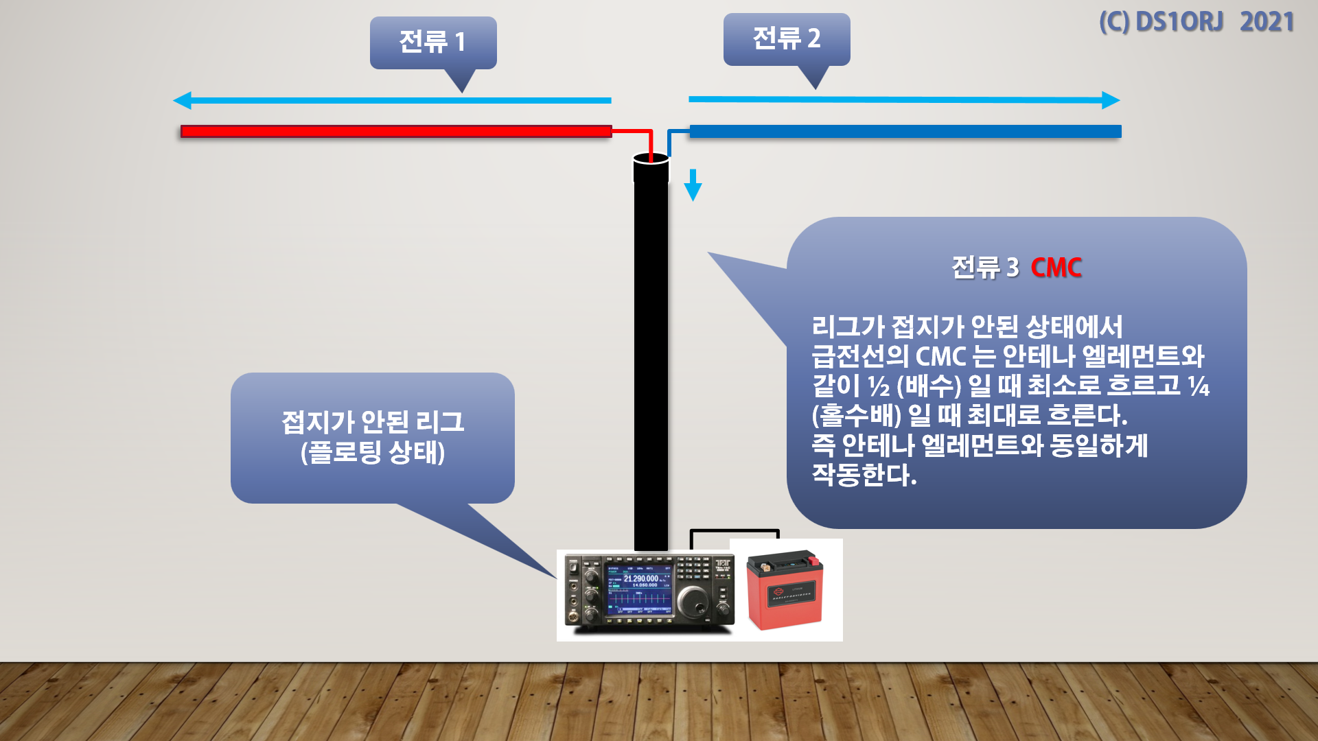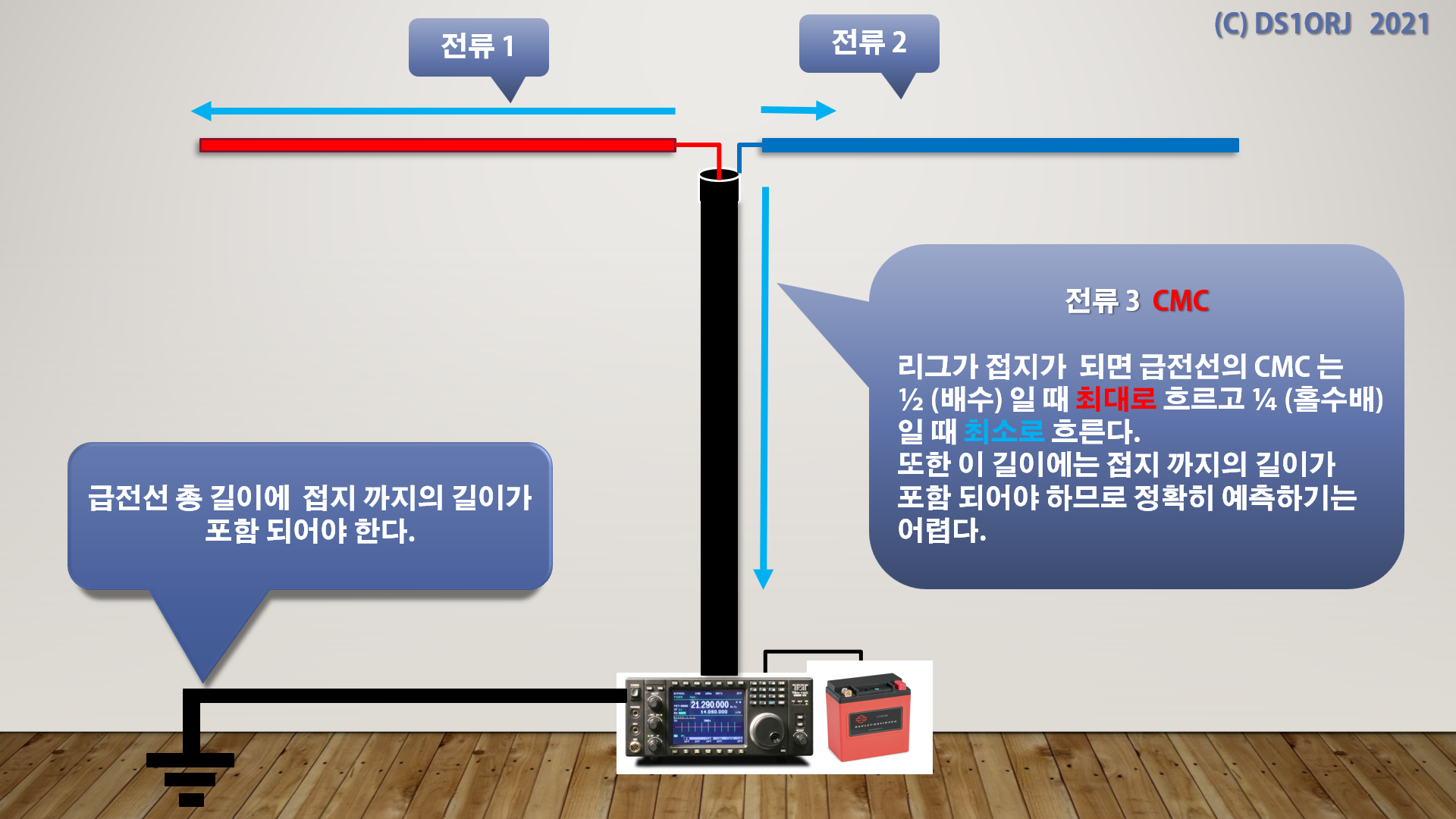 급전선은 복잡한(지면, 전력선, 건물 및 각종 금속물체)경로로 들어오고, 리그는 다양한 경로를 통해 접지 되므로 CMC 최소화를 위한 급전선 길이를 특정 할 수 없다. (접지를 리그 아래에서 땅 속으로 바로 끌고 들어간게 아니라면..) 또한 CMC 는 급전선 표면을 타고오므로 단축률과는 무관하며 급전선의 주변상황(전도체, 유전체 등)에 의해 변한다.