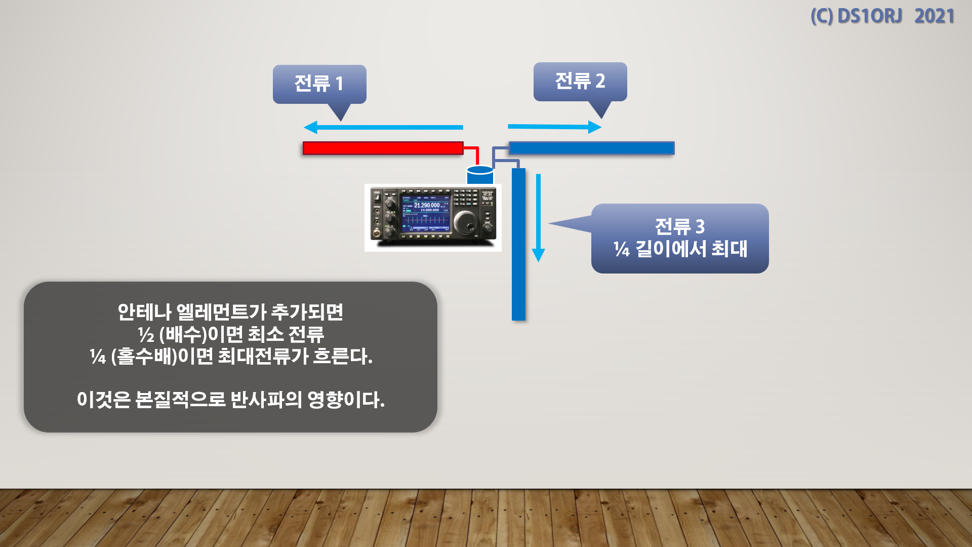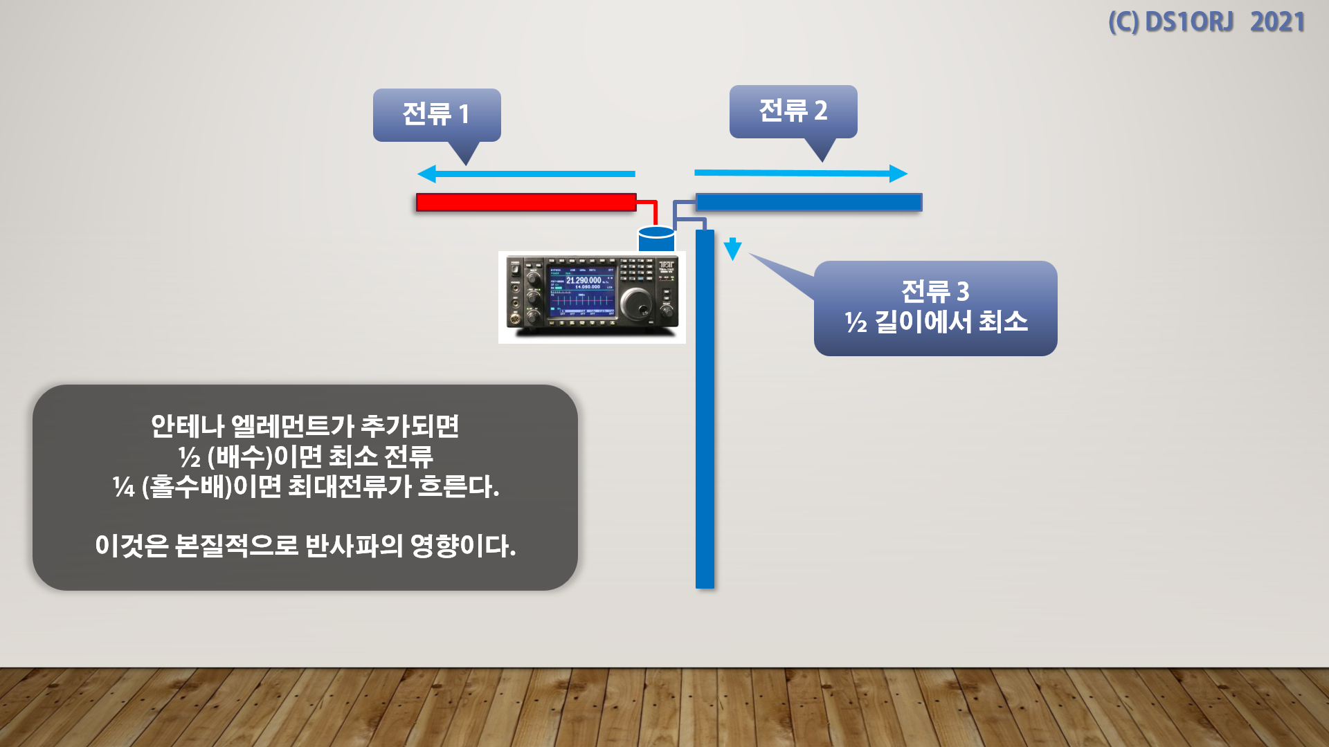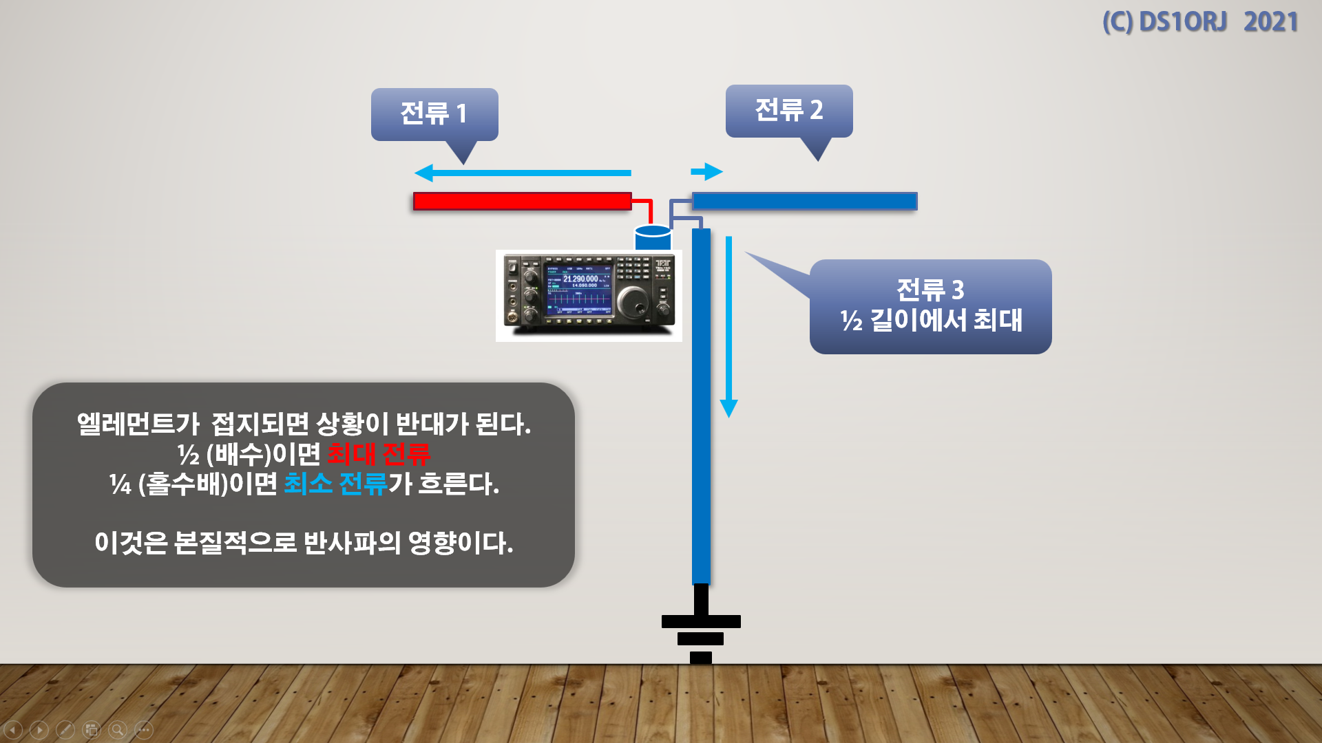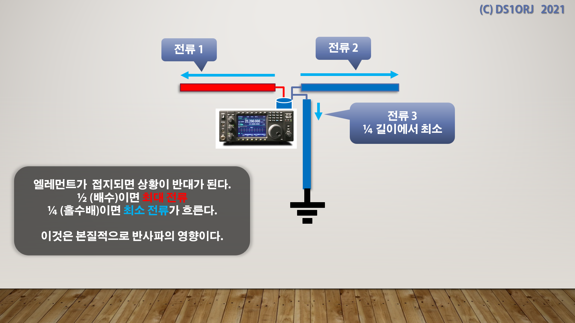 왜 이렇게 되는가, 1/2 파 길이 에서는 끝부분의 임피던스를 반환하므로 끝부분이 접지되어 임피던스가 낮아지면 당연히 전류가 증가한다. 그러나 1/4 파 길이에서는 끝부분의 접지로 임피던스가 내려가면 오히려 반대쪽은 임피던스가 올라간 것처럼 보인다.