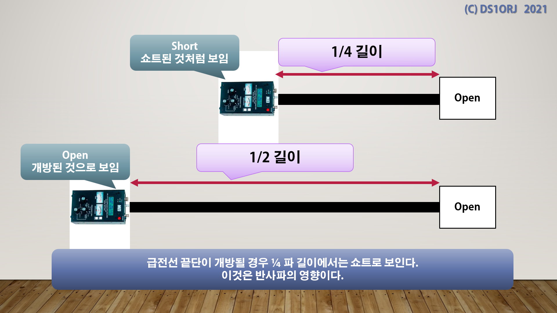 반대로 아래처럼 1/4 파장 길이에서 끝이 쇼트된 급전선은 개방된 것처럼 보인다.