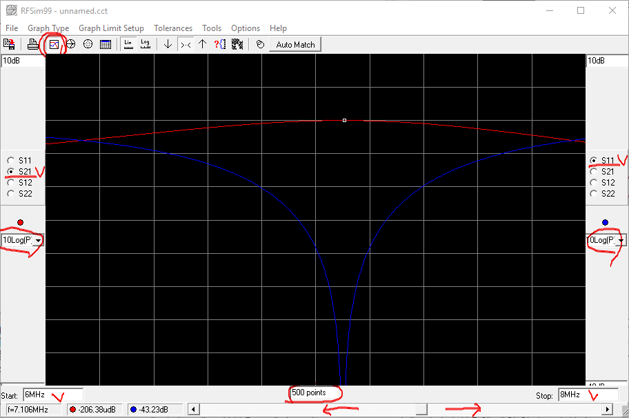보고 싶은 주파수 범위를 지정하는데 여기서는 6MHz 에서 8MHz 를 입력한다 (MHz 영문까지 입력, 입력 안 하면 Hz 로 인식한다). 여기서 중요한 또 하나의 파라미터는 중앙에 위치한 "500 points" 라는 숫자인데 이것은 주어진 주파수 범위를 얼마나 촘촘하게 볼 것인가를 의미한다.(많으면 좋지만 느려진다)