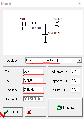 아래는 3200옴을 50옴으로 7.1MHz 에서 매칭하는 값이다.