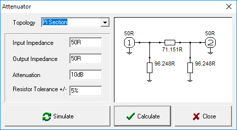 임의 입출력 임피던스에 대해 감쇠기를 계산해준다.(pi, tee 구성)