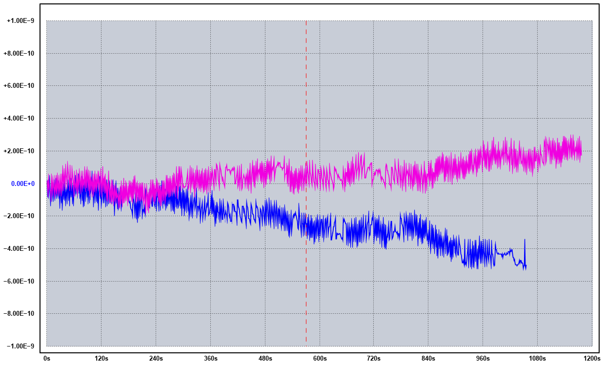 붉은색은 상향 드리프트, 푸른색은 하향 드리프트이다. 위아래로 빠르게 진동하는 것은 1PPS 신호의 지터이다.