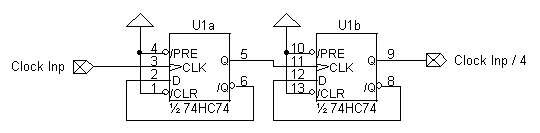 저렴한 Dual FF 를 이용한 4 분주 회로는 아래를 참고하고, 배선 길이는 최단으로 해야 한다. (IC 위나 아래로 점프선을 사용하는 게 제일 낫다) 74HC74 는 최대 주파수가 이미 PIC 의 측정 한계와 비슷하므로 74HC74 를 사용하는 것은 측정 주파수 제한을 높이지 못한다. 회로도는 예시이며 고속 CMOS 인 74AC74 사용해야 한다.