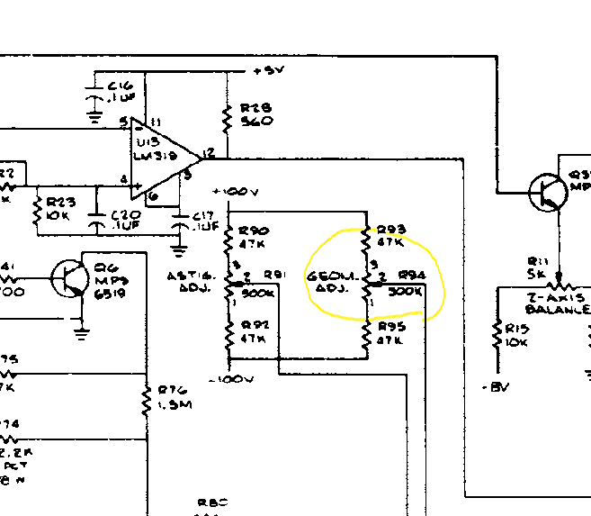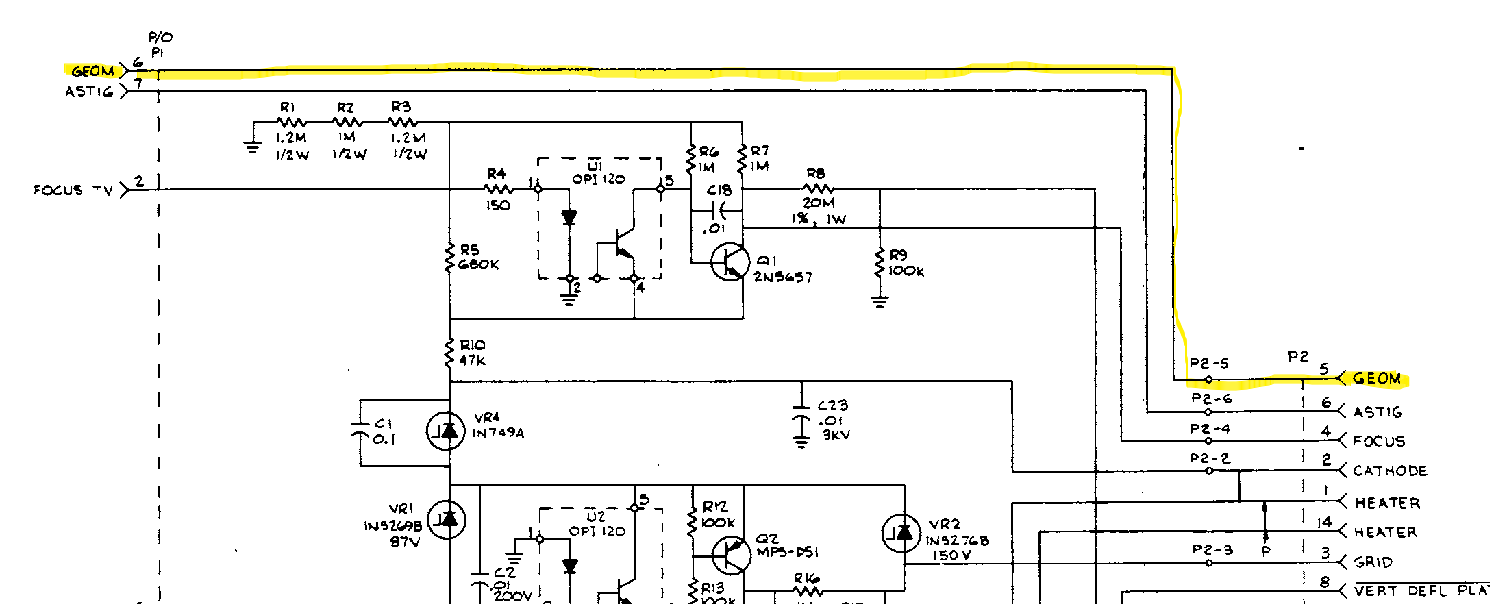 아래 회로도와 같이 CRT 의 커넥터에서 출발하여 어느 회로에도 연결되지 않고 곧바로 트림팟으로 연결되기 때문에 탈 이유가 없다. 트림팟이 타는 유일한 가능성은 CRT 의 5번 GEOM 핀에서 전류가 인출 되는 경우 외에는 없다.