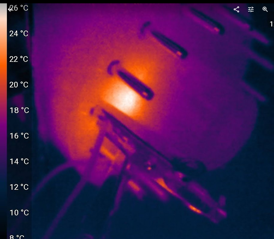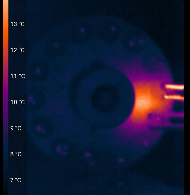 반쯤 포기하고 CRT 내 외부를 열영상으로 찾아보는데 아래와 같이 발열이 촬영된 것이 보인다.