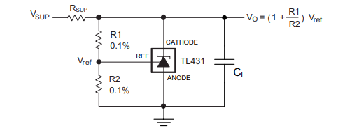 분압 저항을 통해 REF 핀에 피드백 전압을 제공하면 설정된 전압으로 CATHODE, ANODE 간 전압을 임의로 만들 수 있다.