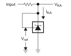 REF 핀이 기준 전압이 되도록 CATHODE 로 부터 전류를 끌어당긴다. (즉 션트 레귤레이션) 그래서 아래처럼 REF 핀을 K(CATHODE) 에 연결하면 2.5V 제너 다이오드와 동일하게 된다. 즉, 아래 회로에서 양단 전압(VKA)은 2.5V 이다.