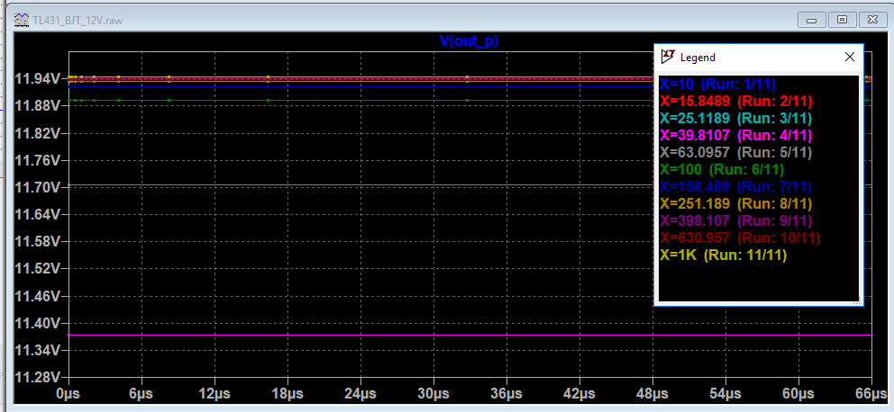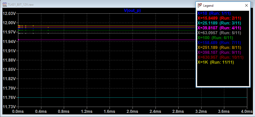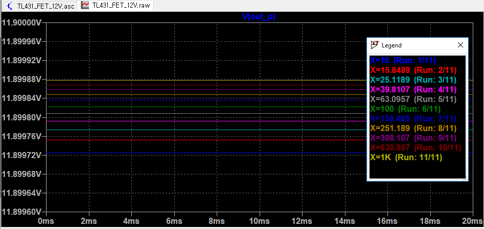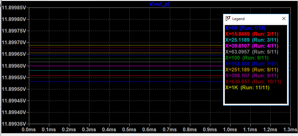 아래는 13V 입력에서 12V 출력이다. 1.2A 부터 12mA 까지 전압 변동은 0.2mV 부근.