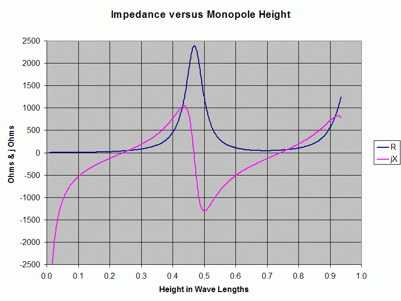 AA5TB 오엠의 모노폴 길이에 따른 임피던스 변화 그래프.