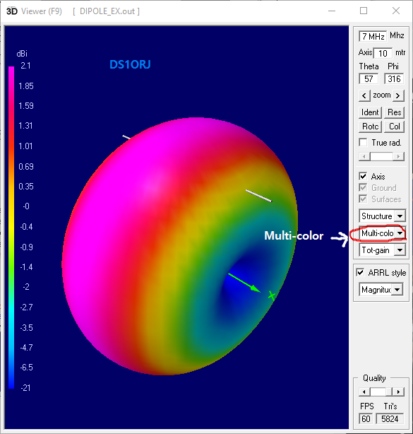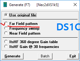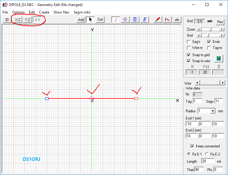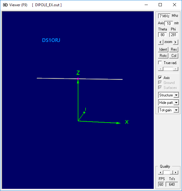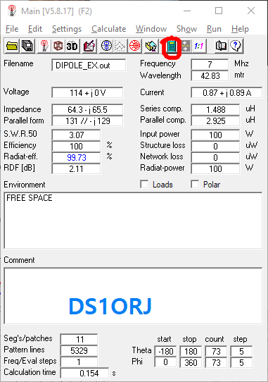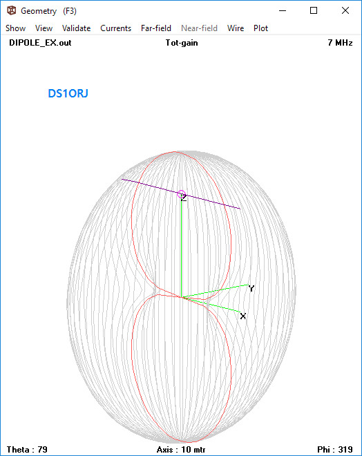 상기 코드는 0.001 반지름(2mm)의 와이어 20 미터를(7메가 1/2 다이폴)를 지상 10 미터 높이에 배치한다