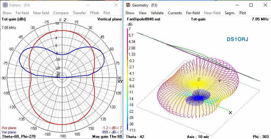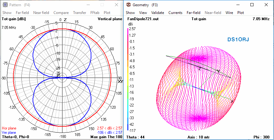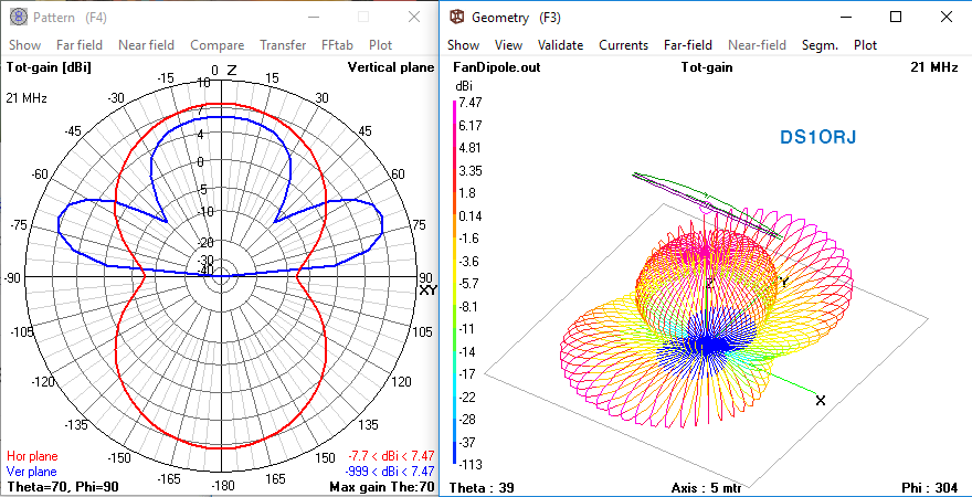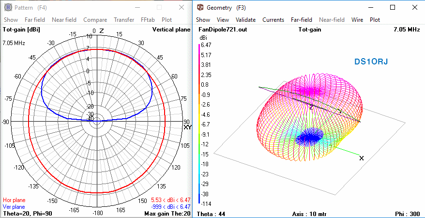 평균 지면에서 지상고 10 미터(7메가의 1/4 파장 높이) 를 설정하고 7, 21 메가의 패턴을 본다.