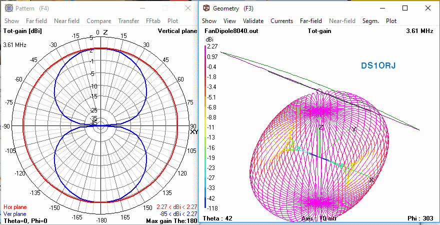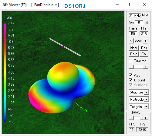팬 다이폴의 경우에는 짝수배 주파수에서는 문제 없이 작동하지만 홀수배 주파수에서는 기본 엘레먼트도 방사를 하므로 패턴이 변경된다. 얼마나 영향이 있는지 4NEC2 시뮬레이션을 통해 알아본다.