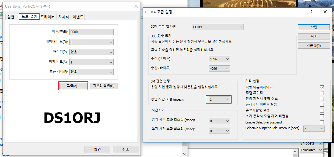 FT232 드라이버 설치 후 윈도우의 "장치관리자" 에서 아래와 같이 고급 설정을 바꾸어 주도록 한다.