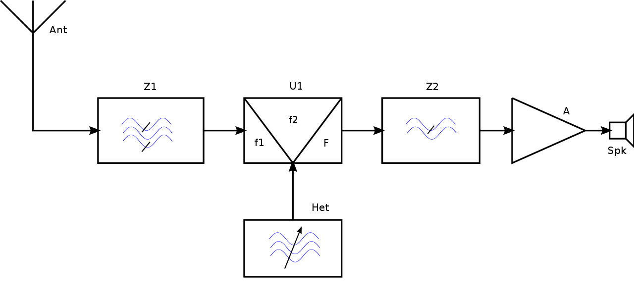 보통 1개의 믹서, 1개의 발진기, 그리고 오디오 증폭기로 구성된다.