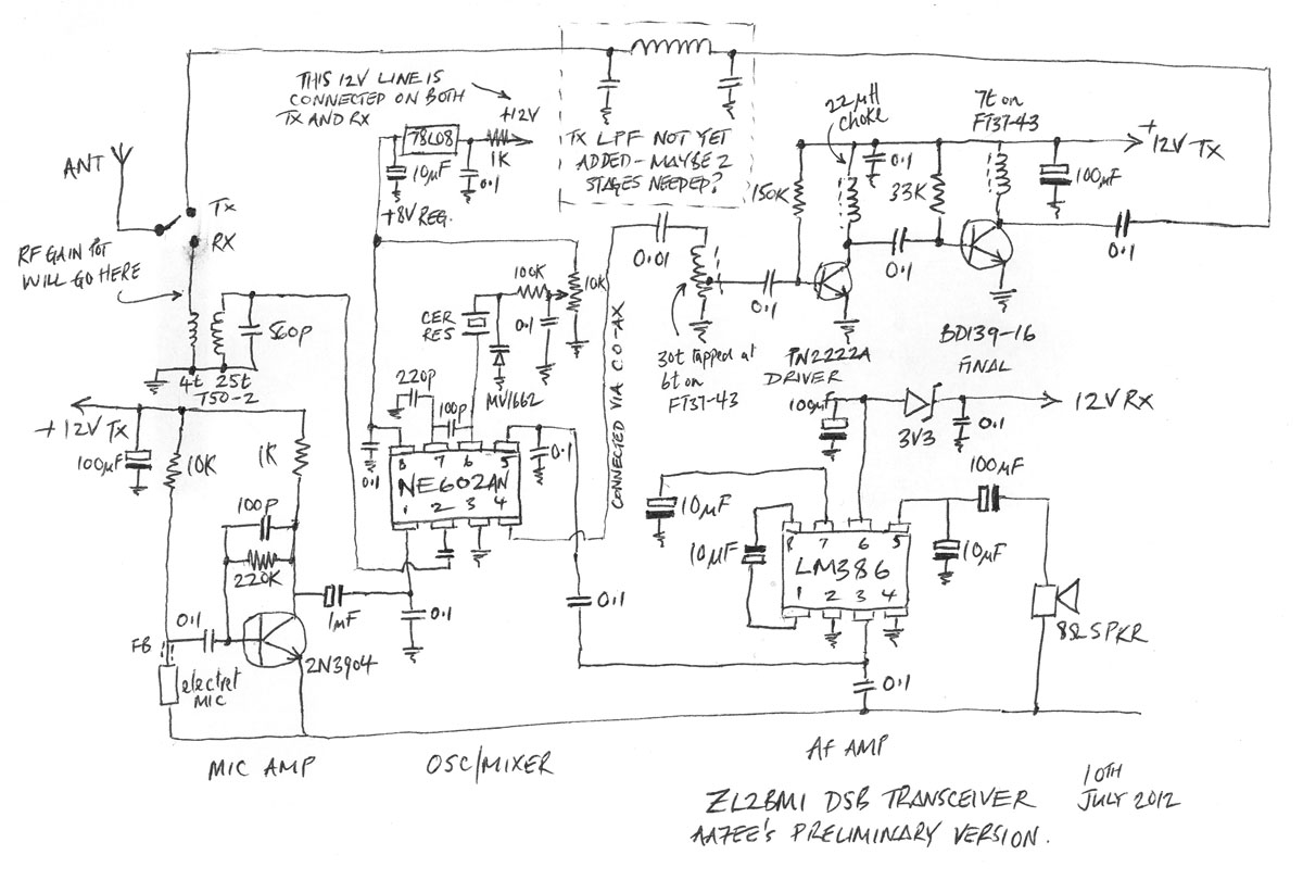 작동대역을 결정하는 몇가지 부품의 값이 없으므로 이대로 만들 수는 없고 회로는 참고용이다. (초기 버전은 80m 밴드용)