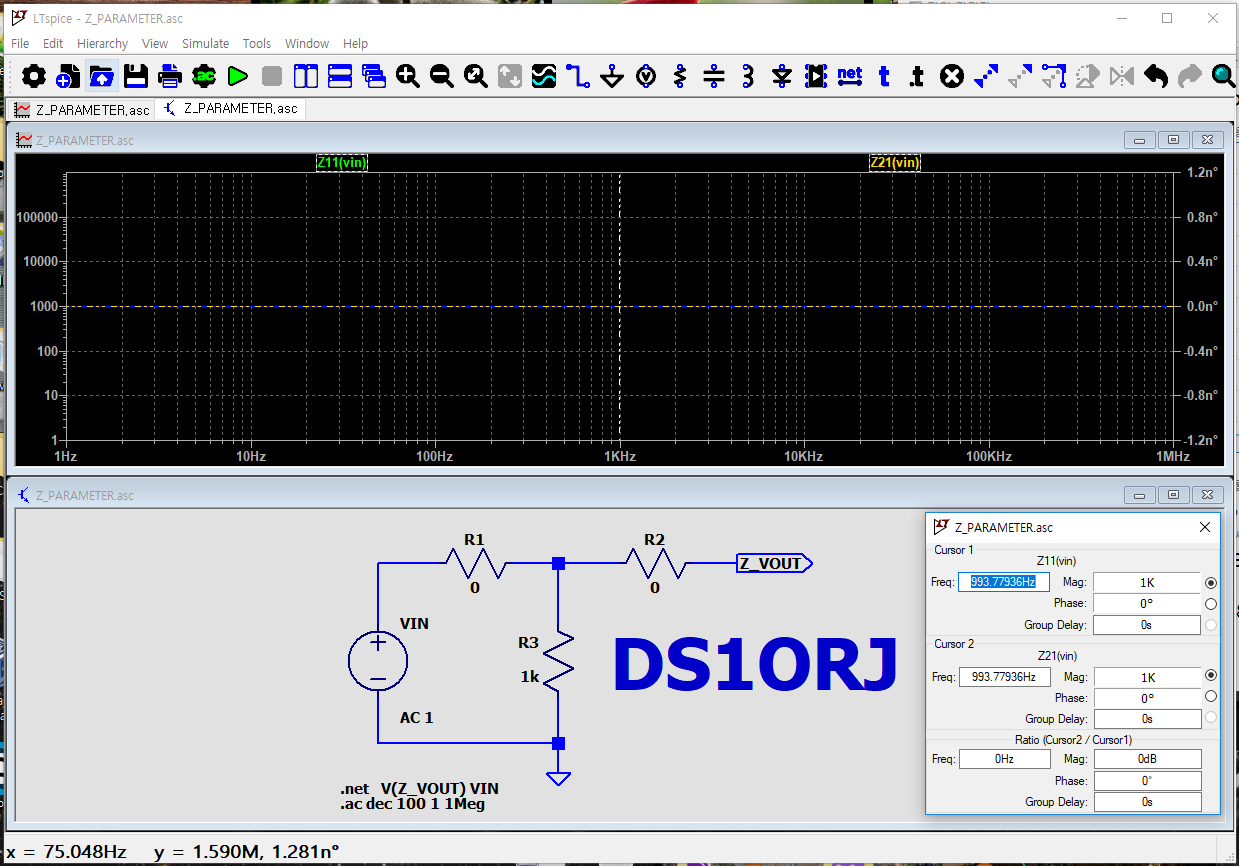 아래는 동일한 회로를 Z 파라미터로 측정하는 LTSpice 회로이다.