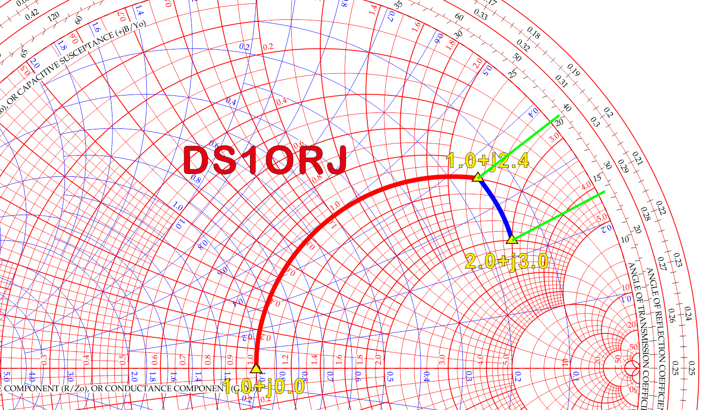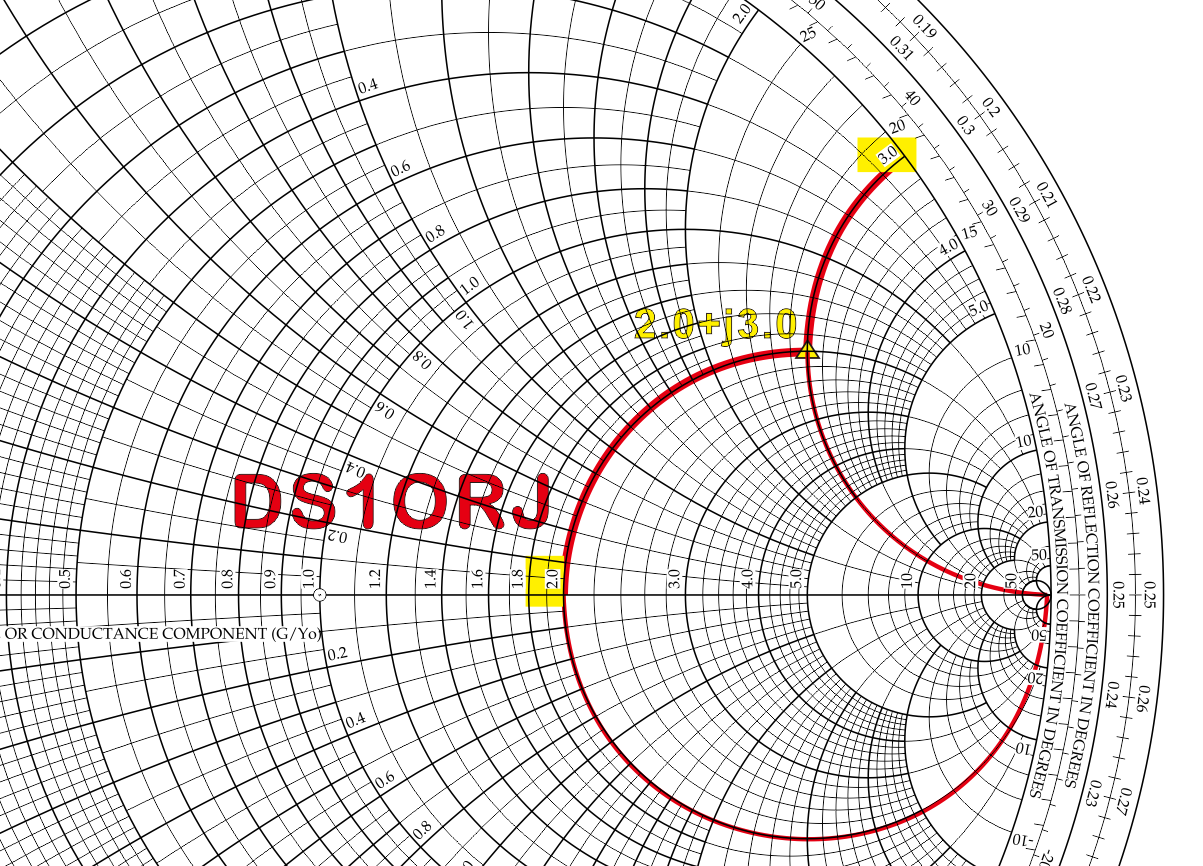 1.0+j2.4 에서 1.0+j0.0 의 중심까지 붉은색 경로는 임피던스 차트의 리액턴스 경로이다. 이 경로는 직렬로 L 또는 C 를 연결하면 이동하게 되는 경로이며 여기서는 반시계 방향(아래)으로 움직였으므로 직렬 C 에 해당한다. 회전 방향이 반대가 되면 직렬 L 이 된다. (어드미턴스와 반대인 것을 알 수 있다)