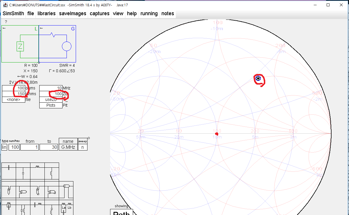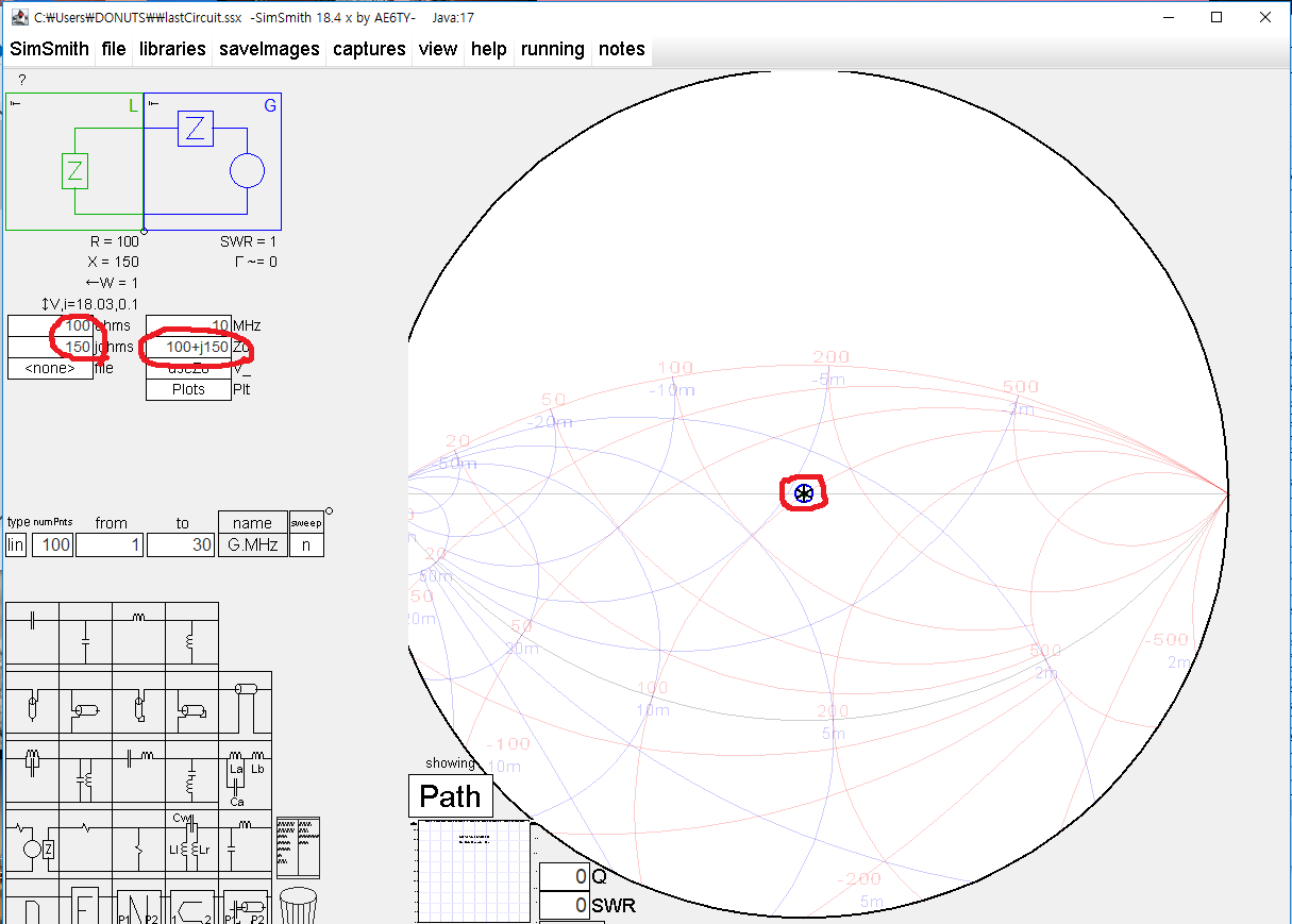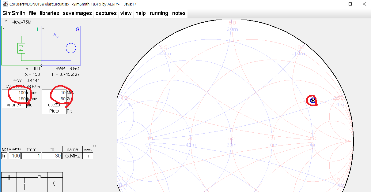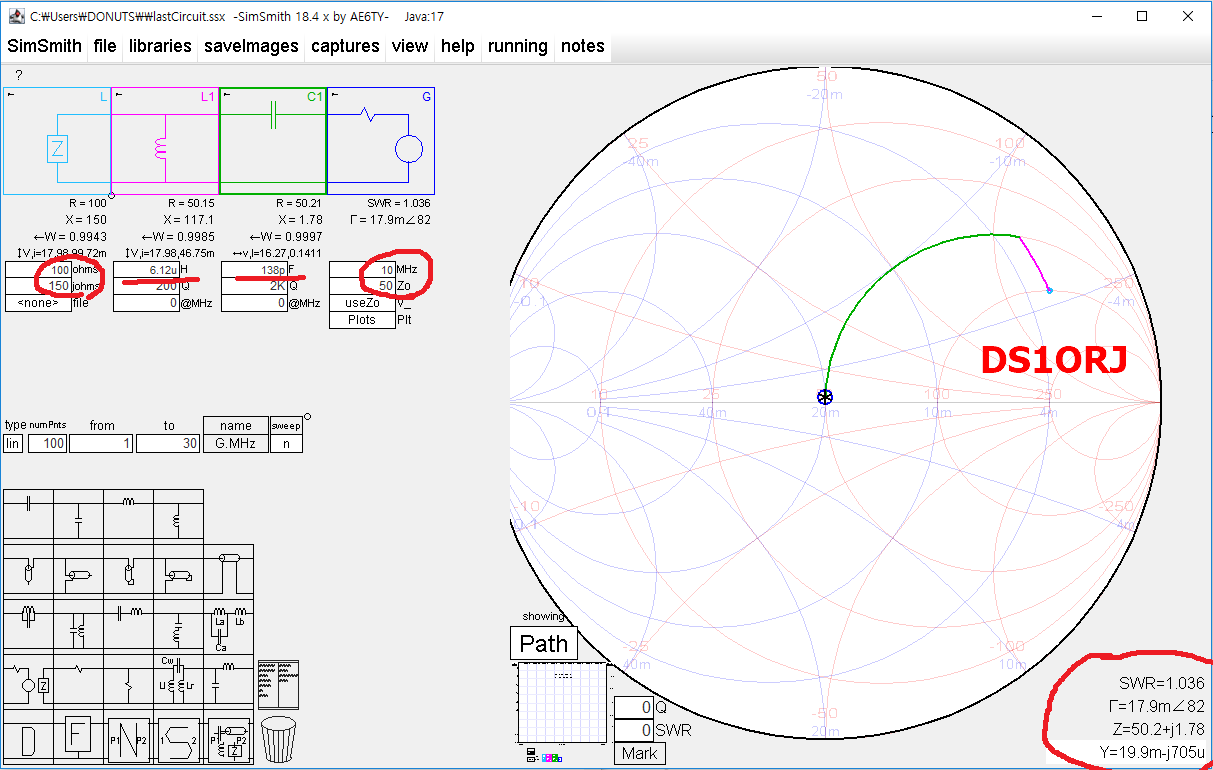 이해를 돕기 위해 부하 임피던스 Z=100+j150 을 위에서 소개한 SimSmith 에서 찍어 보면 아래와 같다.