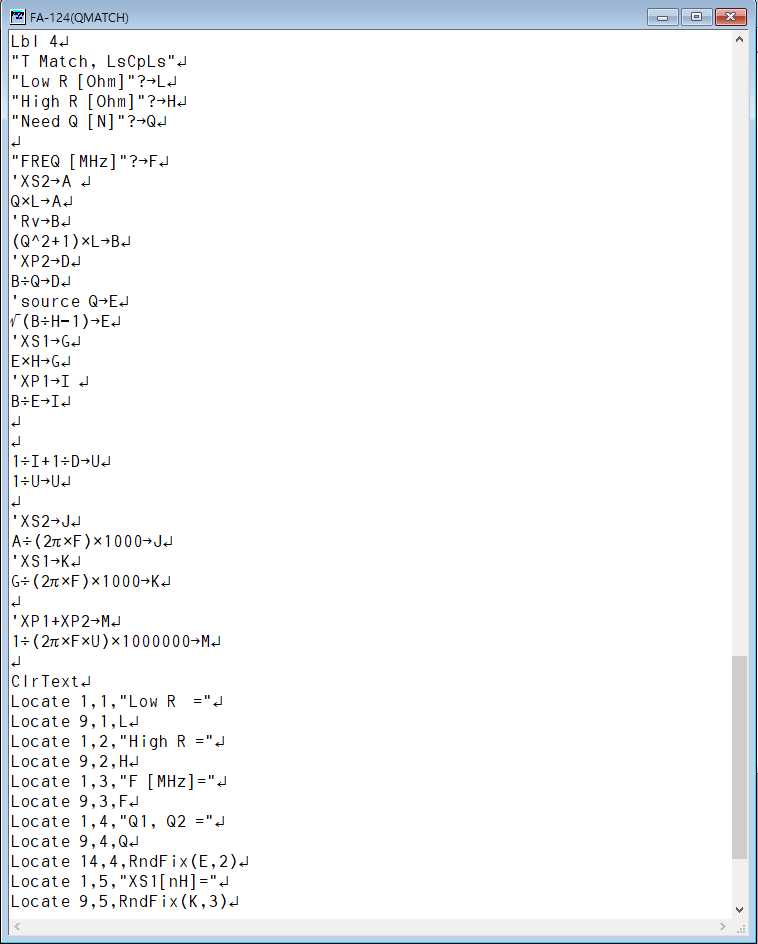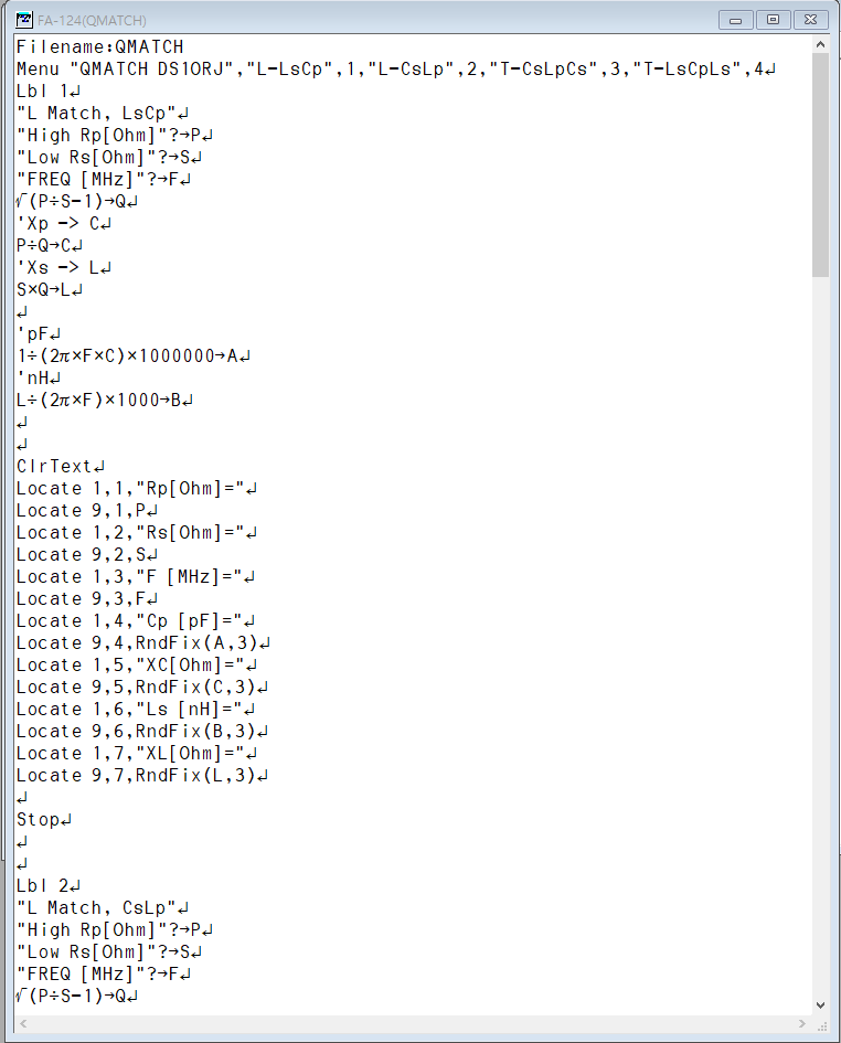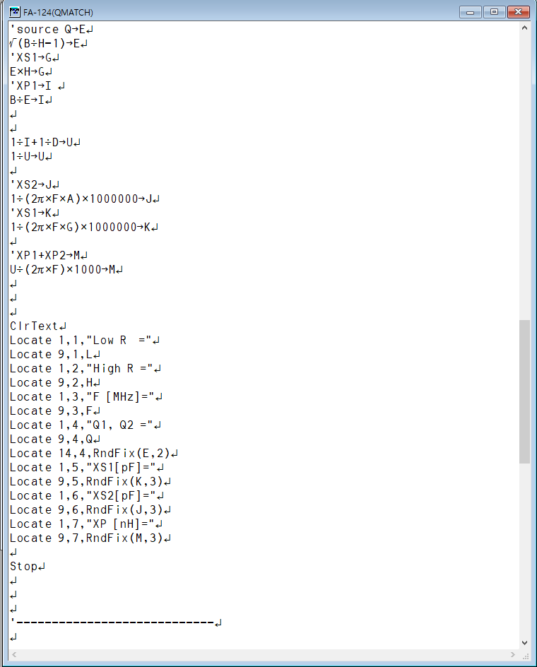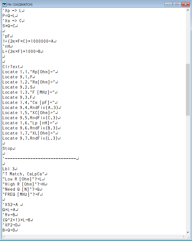 아래는 원문에 제공되는 계산식을 이용하여 임피던스 매칭을 하는 공학용 계산기용 프로그램이다.