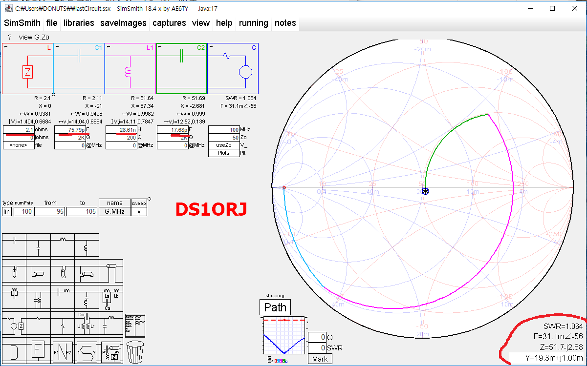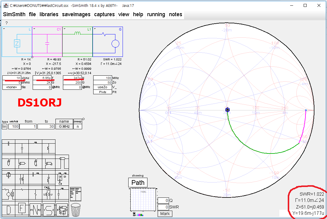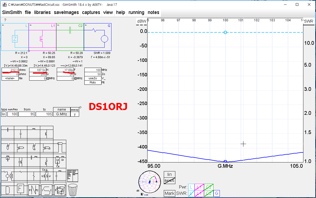 아래는 SimSmith 에서 해당 값으로 임피던스 매칭이 완료된 것을 확인한 것이다.