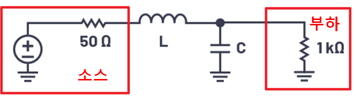 아래 회로는 L, C 를 사용하여 병렬저항 부하(1K옴) 를 소스(50옴)와 매칭시키는 유형이다.