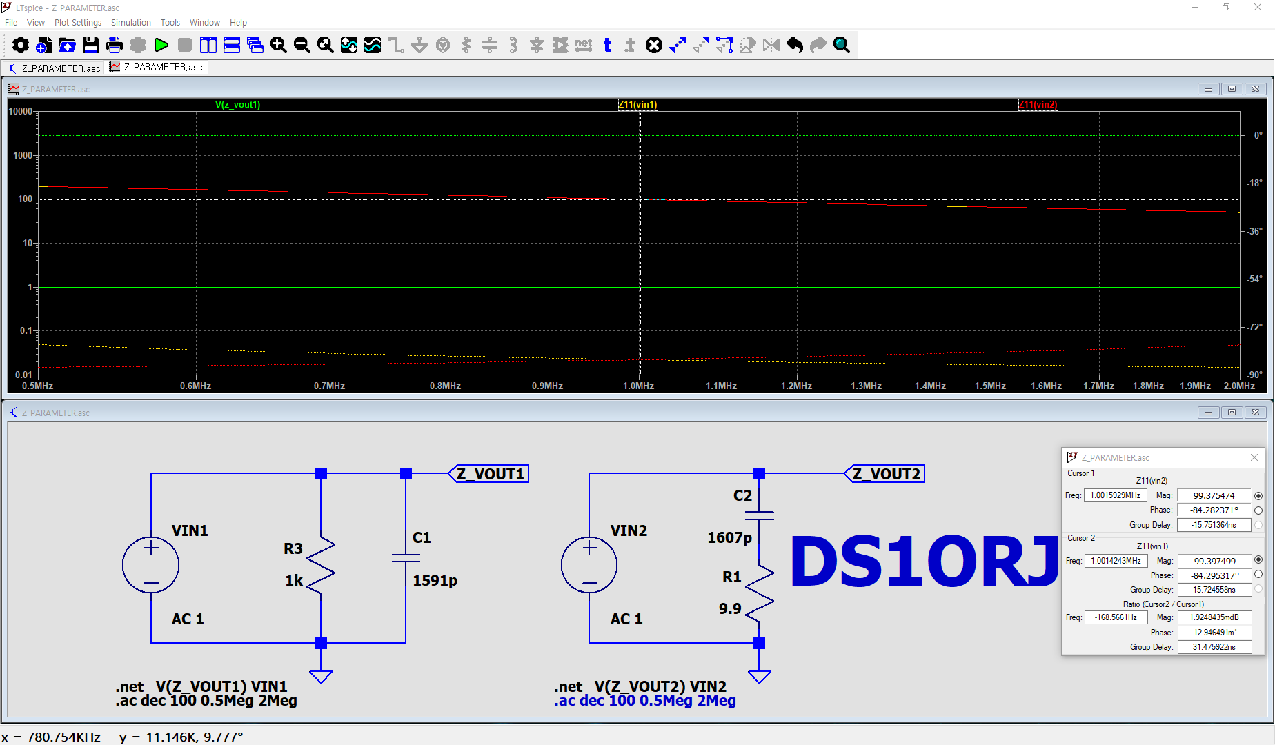 두 회로는 1MHz 에서 임피던스 99옴으로 완전히 같은 회로라는 것을 알 수 있다. (전압과 전류의 위상 까지도 두 회로 모두 같다)
