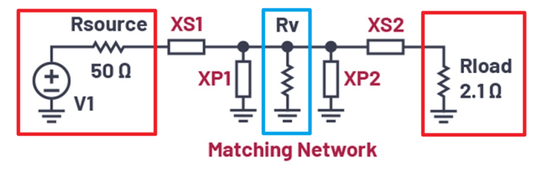 그런 경우는 앞서 설명한 LC 매칭회로를 아래 그림과 같이 좌우에 각각 한번씩 두번 적용한다. 따라서 임피던스 변환이 두번 일어나게 된다. 이렇게 하면 중간에 거쳐가는 저항값(아래 회로에서 Rv, 실제로 회로상에 존재하지 않으며 계산에만 등장한다.)을 임의로 결정 가능하게 된다. 바꿔 말해서 저항을 통해 Q 값을 변경 할 수 있게 된다. (Q 는 저항과 리액턴스의 비율이므로 저항을 변경하면 Q 역시 변경 된다.)