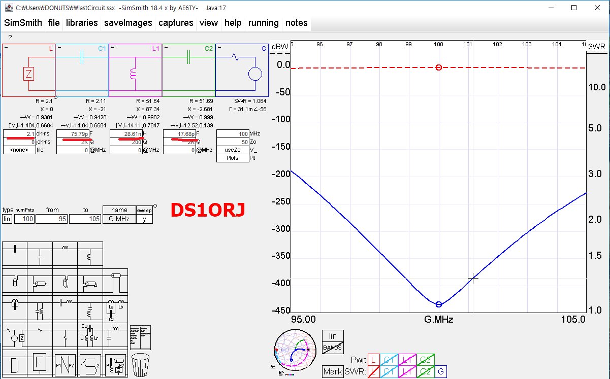 상기 회로는 글 처음에 설명한 방식으로 매칭을 하면 Q=4.776 가 될 것으로 추정한다. (Q = sqrt(50 / 2.1 - 1) = 4.776)