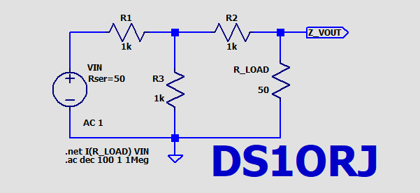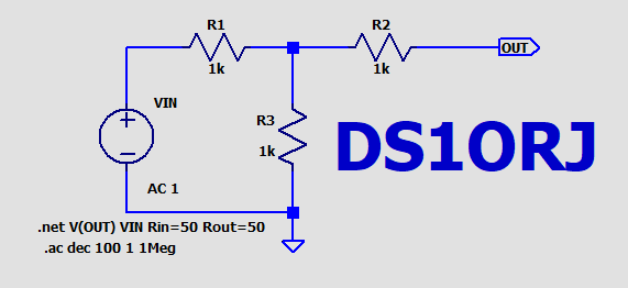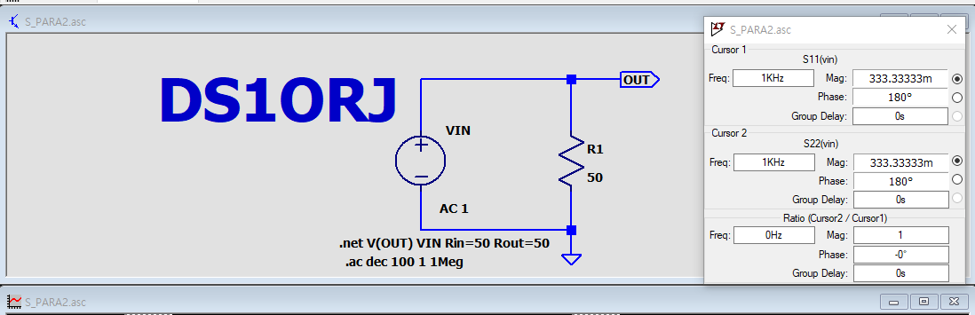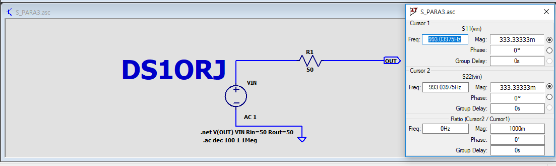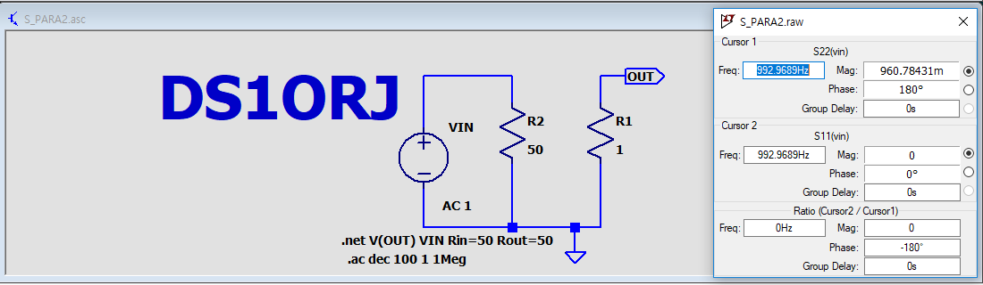 아래 회로를 보면 소스 VIN 의 내부저항(설정에서 Series Resistance)을 50 으로 설정하여 임피던스가 50옴이 되도록 지정한다. 또한 출력측에도 임피던스를 제공하는 저항(회로상의 R_LOAD)을 명시적으로 지정하여 임피던스가 50옴이 되도록 지정한다. 마지막으로 .net 지시문을 통해 R_LOAD 가 출력측(포트2) 이고 VIN 이 입력측(포트1) 임을 알려준다.
