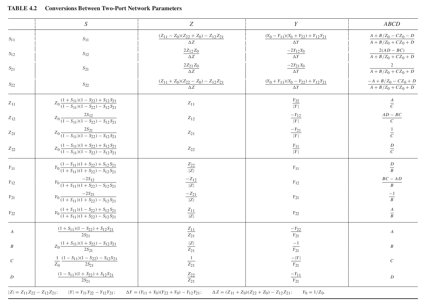 S 파라미터와 Y, Z 파라미터의 상호 변환 공식은 아래를 참고한다. (David Pozar)