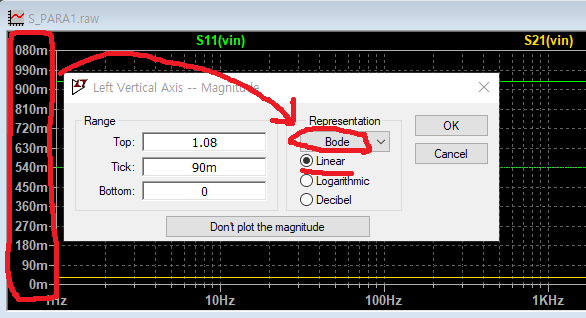 ※ 만약 아무것도 없는 Plot 윈도우일 경우 "Add Trace" 을 선택하여 S11, S12, S21, S22 를 추가한다. 이 값을 보려면 Plot 윈도우에서 'C' 를 눌러서 커서를 만들고 상단의 S11(vin), S22(vin) 등의 이름을 클릭한다, 커서는 2개 까지 만들 수 있다. 참고로 수직축을 마우스로 클릭하면 표시 단위를 바꿀 수 있다. 아래 그림을 참고한다.