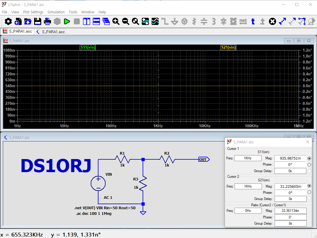이제 Y, Z 파라미터 시뮬레이션과 동일한 회로의 시뮬레이션을 아래와 같이 실행한다.