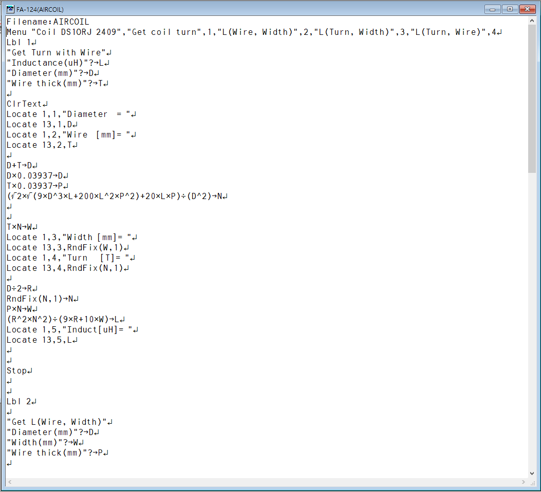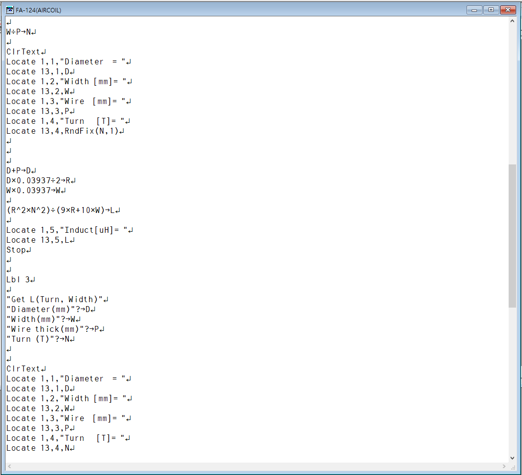 이전 글을 읽었다면 이미 알겠지만, 이 계산기는 자체적인 코드 페이지를 사용하므로 붙여넣기를 하면 기호가 다 깨져서 볼 수 없게 된다. 소스는 CASIO FA-124 프로그램을 설치하면 직접 편집이 가능하다.